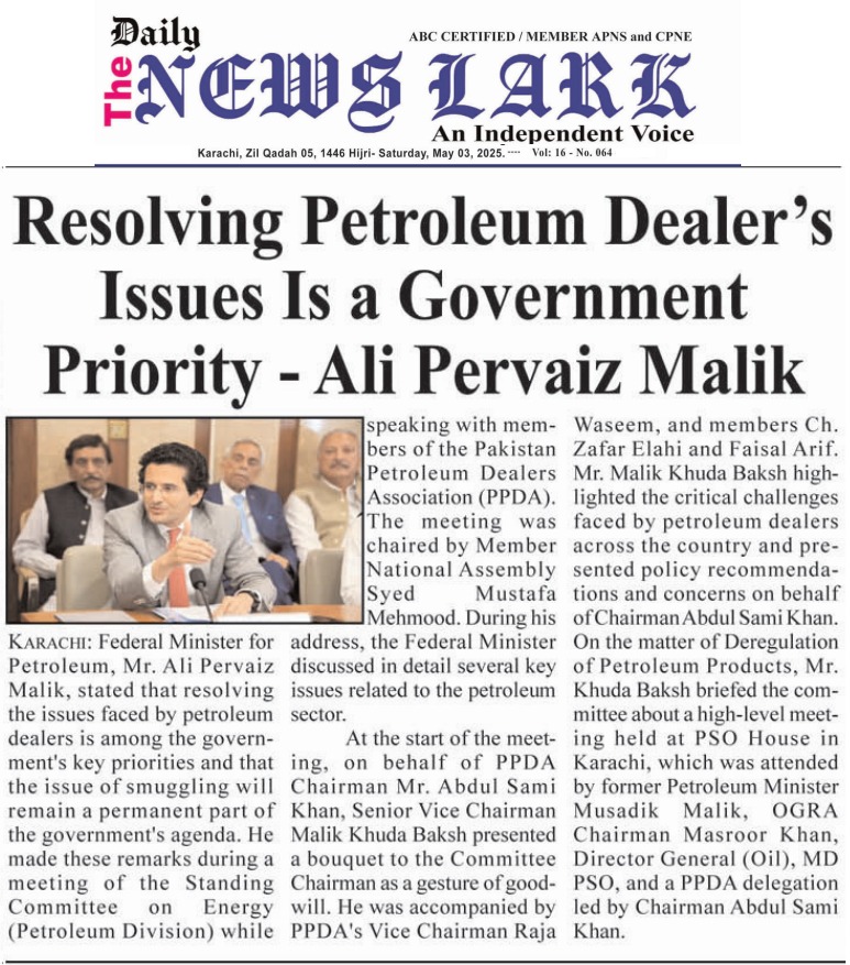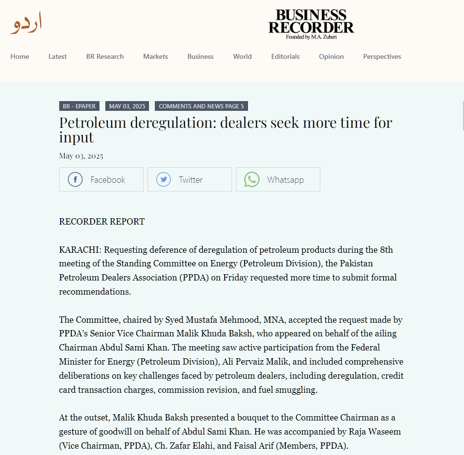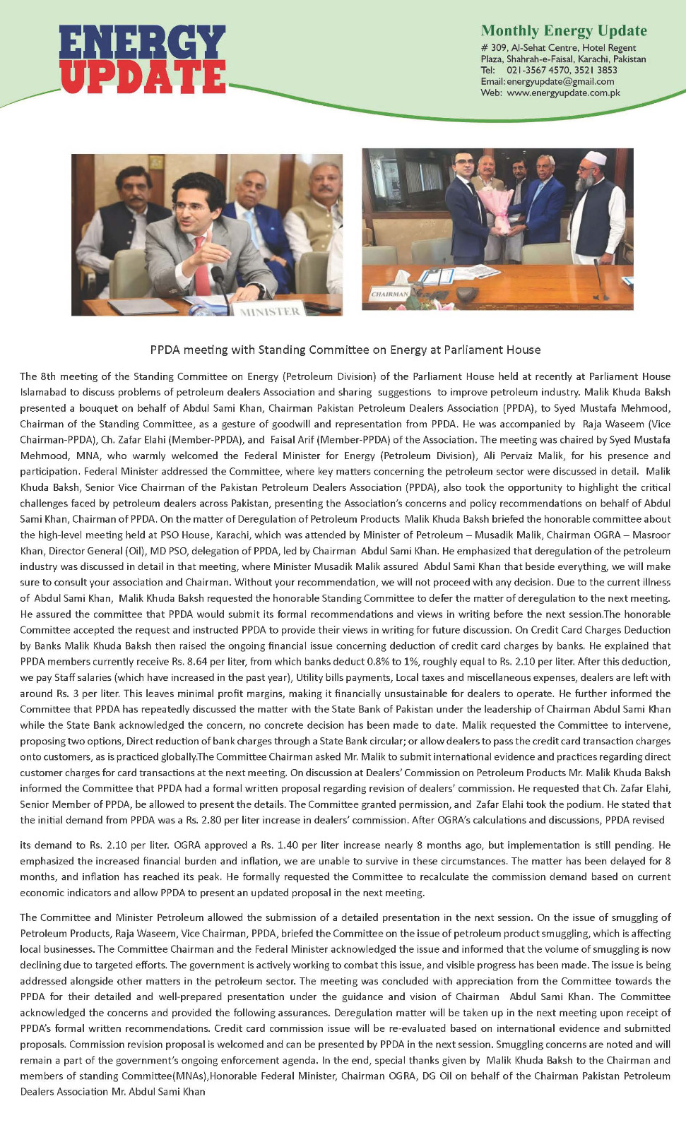 The 8th meeting of the Standing Committee on Energy (Petroleum Division) of the Parliament House was held on 29-April-2025 at 2:00 p.m. at Parliament House, Islamabad. Mr. Malik Khuda Baksh presented a bouquet on behalf of Mr. Abdul Sami Khan, Chairman Pakistan Petroleum Dealers Association (PPDA), to Syed Mustafa Mehmood, Chairman of the Standing Committee, as a gesture of goodwill and representation from PPDA. He was accompanied by Mr. Raja Waseem (Vice Chairman-PPDA), Mr. Ch. Zafar Elahi (Member-PPDA), and Mr. Faisal Arif (Member-PPDA) of the Association. The meeting was chaired by Syed Mustafa Mehmood, MNA, who warmly welcomed the Federal Minister for Energy (Petroleum Division), Mr. Ali Pervaiz Malik, for his presence and participation. Federal Minister addressed the Committee, where key matters concerning the petroleum sector were discussed in detail. Mr. Malik Khuda Baksh, Senior Vice Chairman of the Pakistan Petroleum Dealers Association (PPDA), also took the opportunity to highlight the critical challenges faced by petroleum dealers across Pakistan, presenting the Association’s concerns and policy recommendations on behalf of Mr. Abdul Sami Khan, Chairman of PPDA. On the matter of Deregulation of Petroleum Products Mr. Malik Khuda Baksh briefed the honorable committee about the high-level meeting held at PSO House, Karachi, which was attended by Minister of Petroleum – Musadik Malik, Chairman OGRA – Masroor Khan, Director General (Oil), MD PSO, delegation of PPDA, led by Chairman Mr. Abdul Sami Khan. He emphasized that deregulation of the petroleum industry was discussed in detail in that meeting, where Minister Musadik Malik assured Mr. Abdul Sami Khan that beside everything, we will make sure to consult your association and Chairman. Without your recommendation, we will not proceed with any decision. Due to the current illness of Mr. Abdul Sami Khan, Mr. Malik Khuda Baksh requested the honorable Standing Committee to defer the matter of deregulation to the next meeting. He assured the committee that PPDA would submit its formal recommendations and views in writing before the next session.The honorable Committee accepted the request and instructed PPDA to provide their views in writing for future discussion. On Credit Card Charges Deduction by Banks Mr. Malik Khuda Baksh then raised the ongoing financial issue concerning deduction of credit card charges by banks. He explained that PPDA members currently receive Rs. 8.64 per liter, from which banks deduct 0.8% to 1%, roughly equal to Rs. 2.10 per liter. After this deduction, we pay Staff salaries (which have increased in the past year), Utility bills payments, Local taxes and miscellaneous expenses, dealers are left with around Rs. 3 per liter. This leaves minimal profit margins, making it financially unsustainable for dealers to operate. He further informed the Committee that PPDA has repeatedly discussed the matter with the State Bank of Pakistan under the leadership of Chairman Abdul Sami Khan while the State Bank acknowledged the concern, no concrete decision has been made to date. Mr. Malik requested the Committee to intervene, proposing two options, Direct reduction of bank charges through a State Bank circular; or allow dealers to pass the credit card transaction charges onto customers, as is practiced globally.The Committee Chairman asked Mr. Malik to submit international evidence and practices regarding direct customer charges for card transactions at the next meeting. On discussion at Dealers’ Commission on Petroleum Products Mr. Malik Khuda Baksh informed the Committee that PPDA had a formal written proposal regarding revision of dealers’ commission. He requested that Mr. Ch. Zafar Elahi, Senior Member of PPDA, be allowed to present the details. The Committee granted permission, and Mr. Zafar Elahi took the podium. He stated that the initial demand from PPDA was a Rs. 2.80 per liter increase in dealers’ commission. After OGRA’s calculations and discussions, PPDA revised its demand to Rs. 2.10 per liter. OGRA approved a Rs. 1.40 per liter increase nearly 8 months ago, but implementation is still pending. He emphasized the increased financial burden and inflation, we are unable to survive in these circumstances. The matter has been delayed for 8 months, and inflation has reached its peak. He formally requested the Committee to recalculate the commission demand based on current economic indicators and allow PPDA to present an updated proposal in the next meeting.